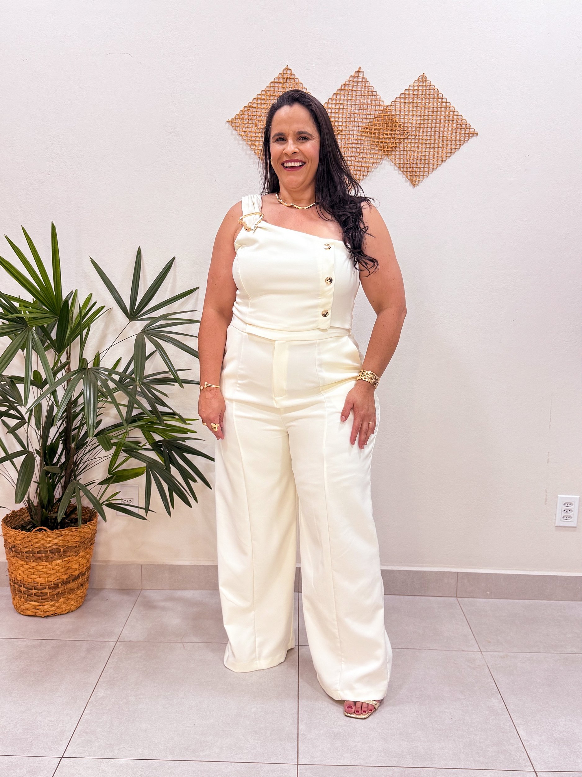 Conjunto: Modelo composto pela cropped e pantalona. Cropped modelo de ombro só, lastex nas costas e fivela orgânica. Pantalona também possui elástico no cós, vestindo super bem.
