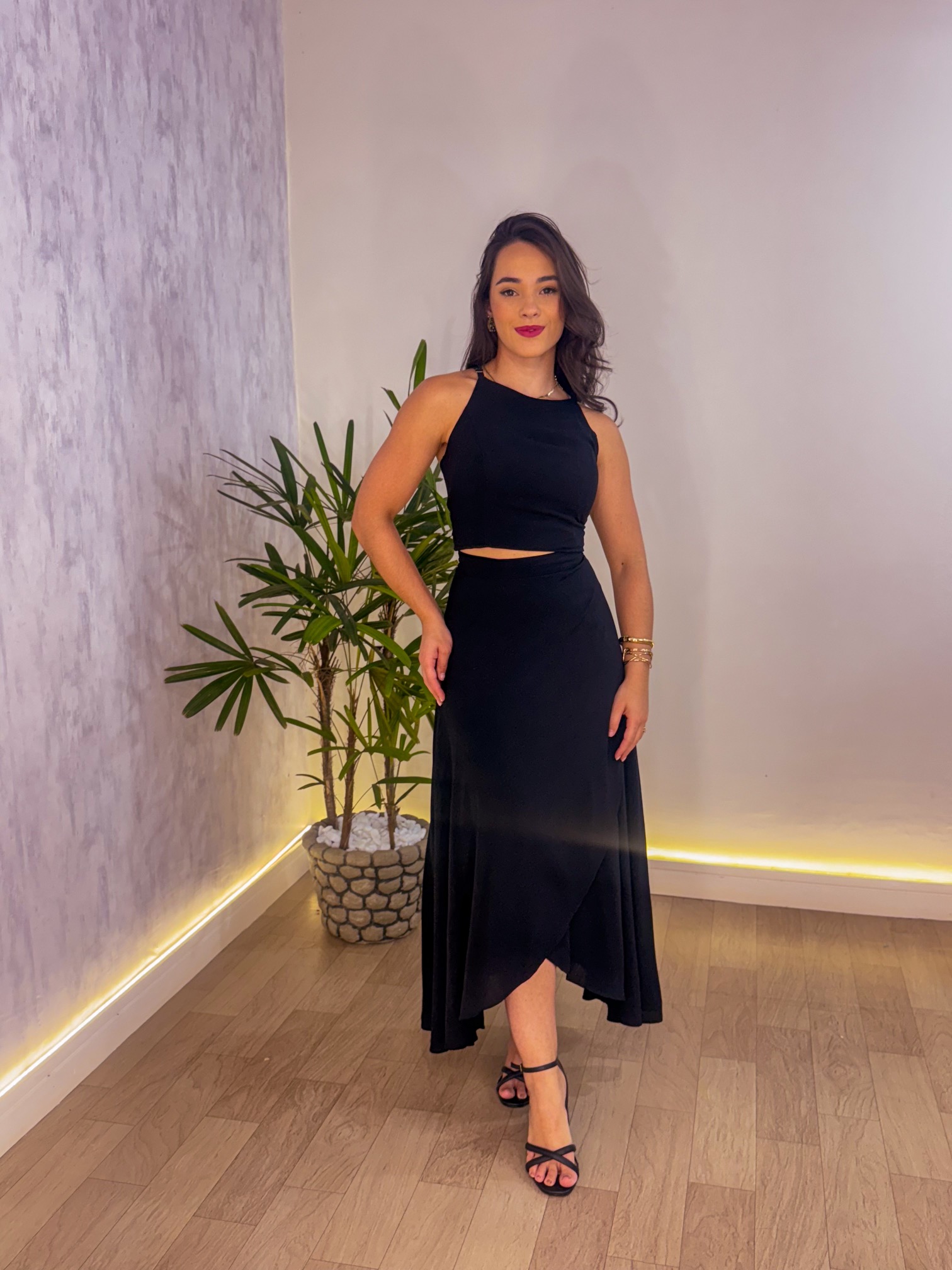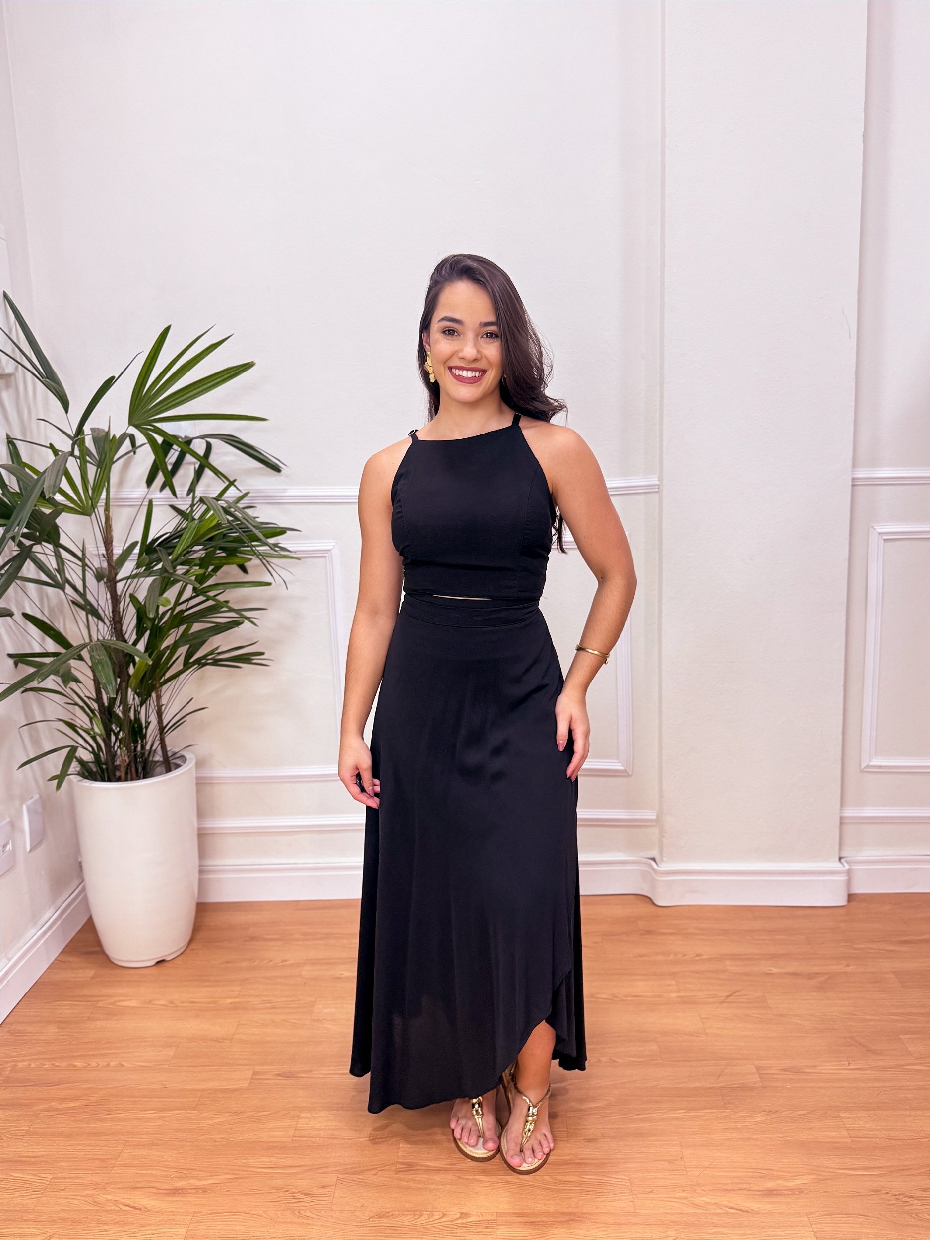 Conjunto: Conjunto composto por saia e cropped. Saia cintura alta modelo envelope com detalhe assimétrico na barra. Cropped com alças finas reguláveis e amarração nas costas.
