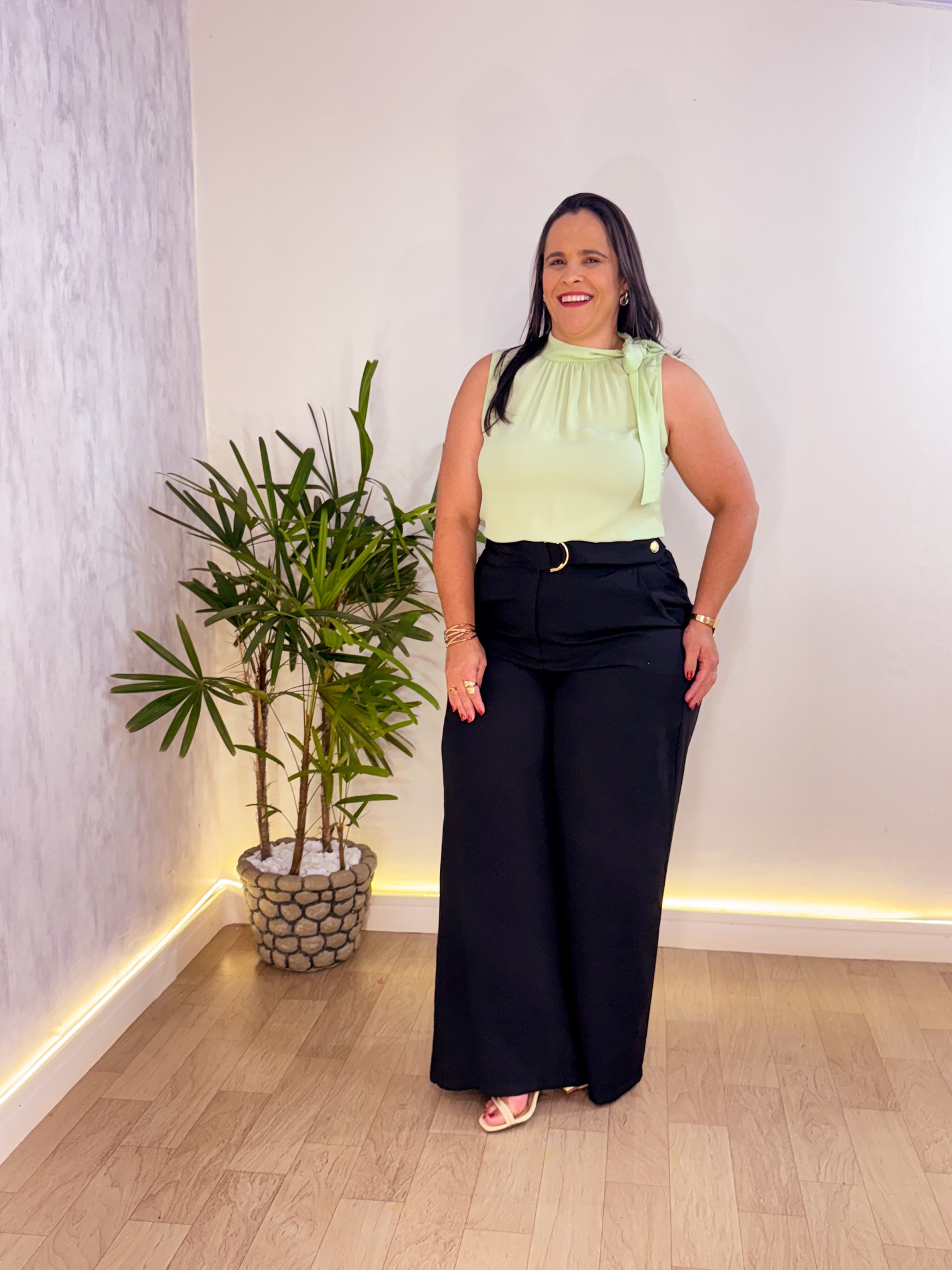 Pantalona: Cós alto com elástico na parte de trás da cintura, cinto com passante dourado, bolsos laterais.