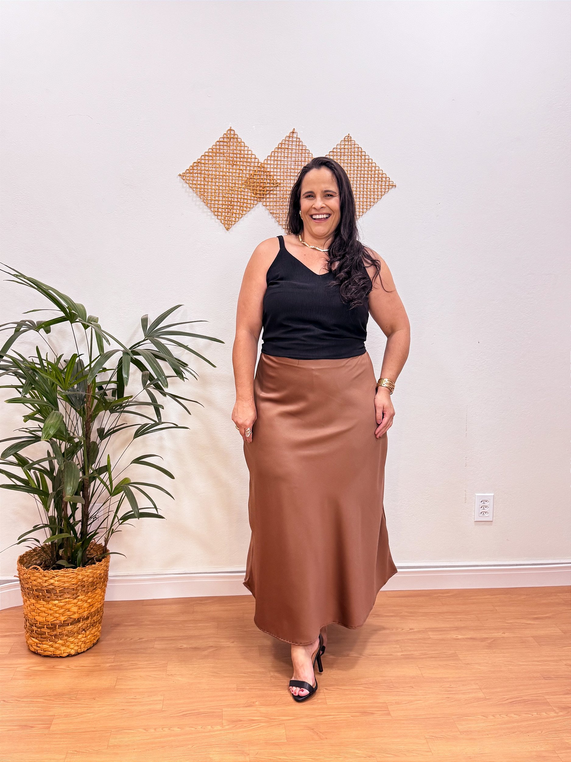 Confeccionada em cetim de alta qualidade, possui brilho sutil e movimento fluido, trazendo um visual moderno e super atual. O comprimento midi garante elegância, enquanto o corte versátil permite composições que vão do casual ao sofisticado com facilidade.