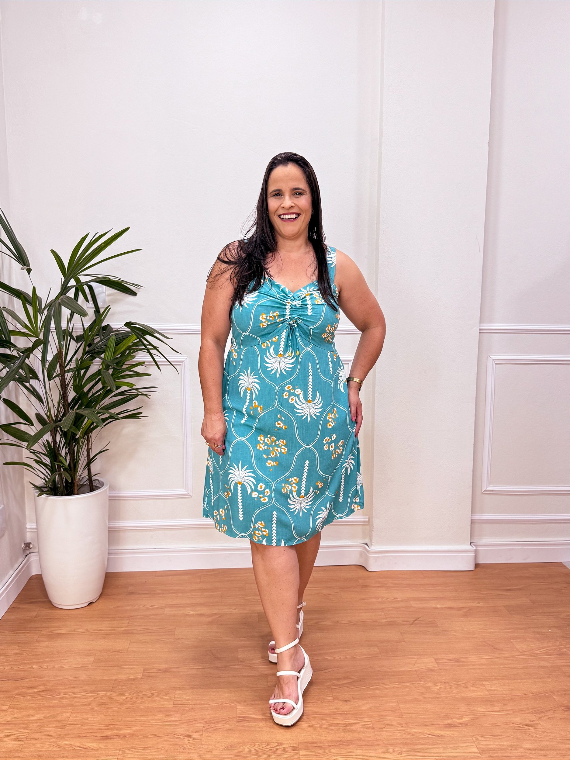 Vestido: Modelo curto com alças largas, decote com ajuste franzido, lastex nas costas.