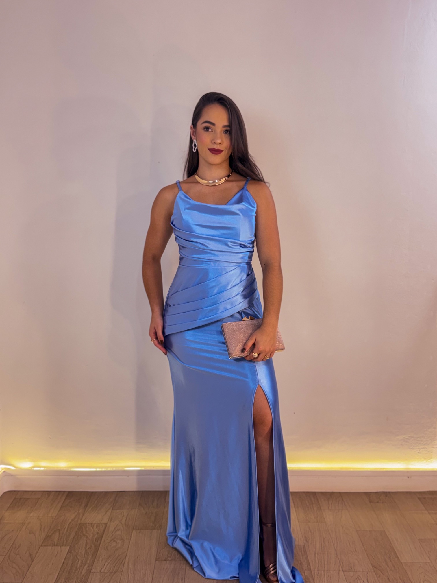 Vestido: Alças finas reguláveis, fechamento em zíper nas costas, detalhe drapeado na cintura, saia bem longa com fenda frontal.