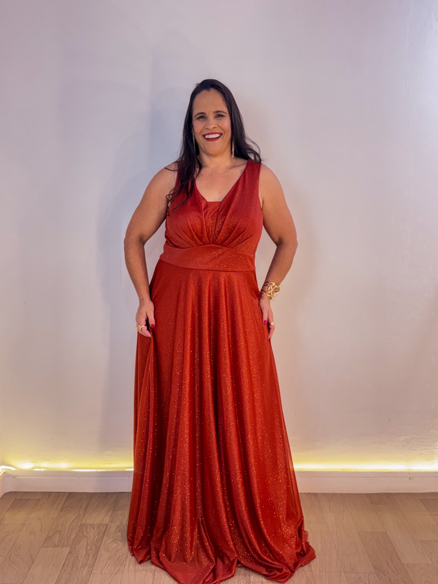 O Vestido Festa Raiane Plus Size Terracota, é confeccionado em tule com brilho, um tecido com elastano, leve, macio e muito confortável.