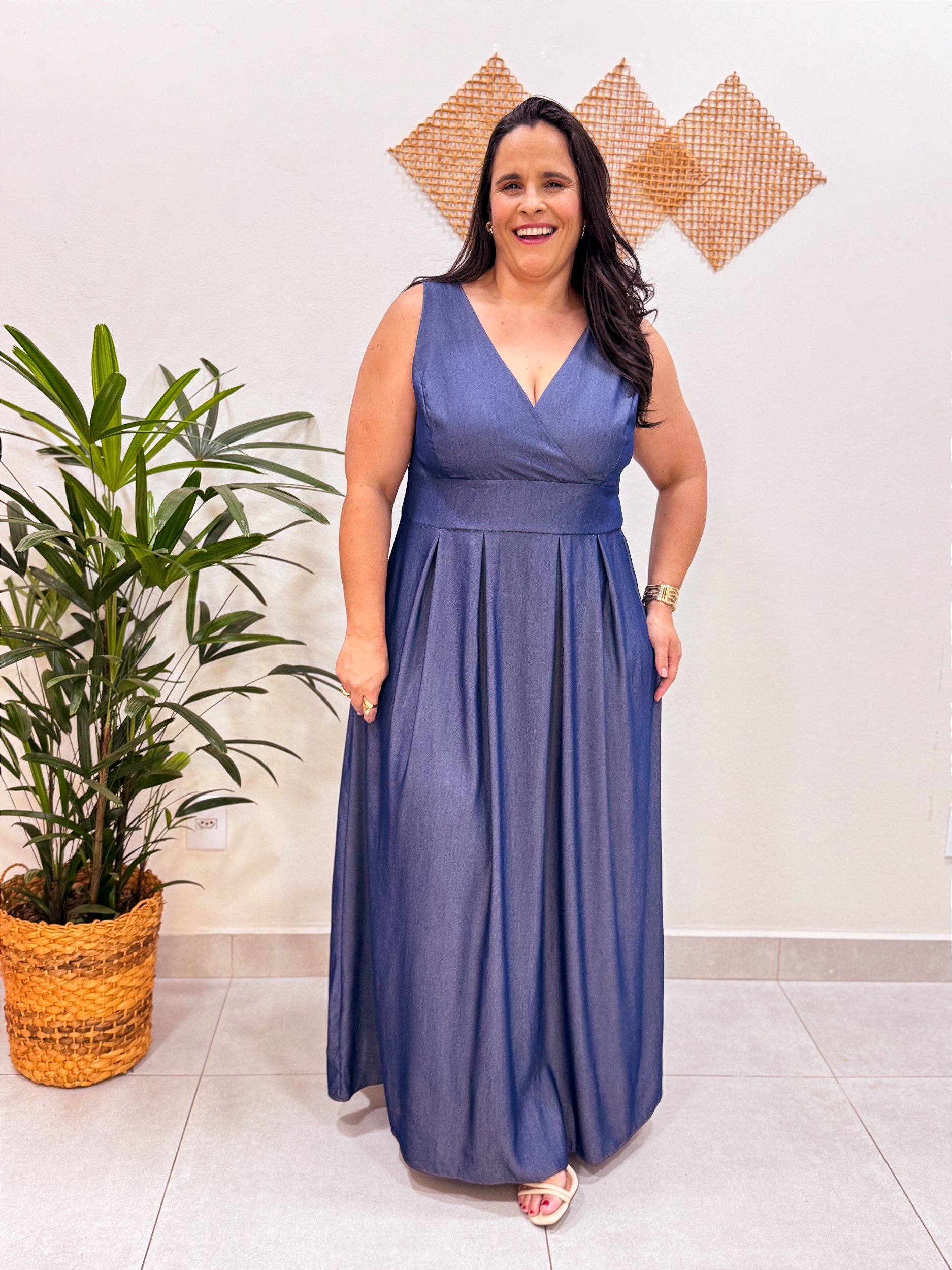 O Vestido Jeans Naira Plus Size, é confeccionado em tecel jeans, um tecido com elastano, elegante, macio e muito confortável.