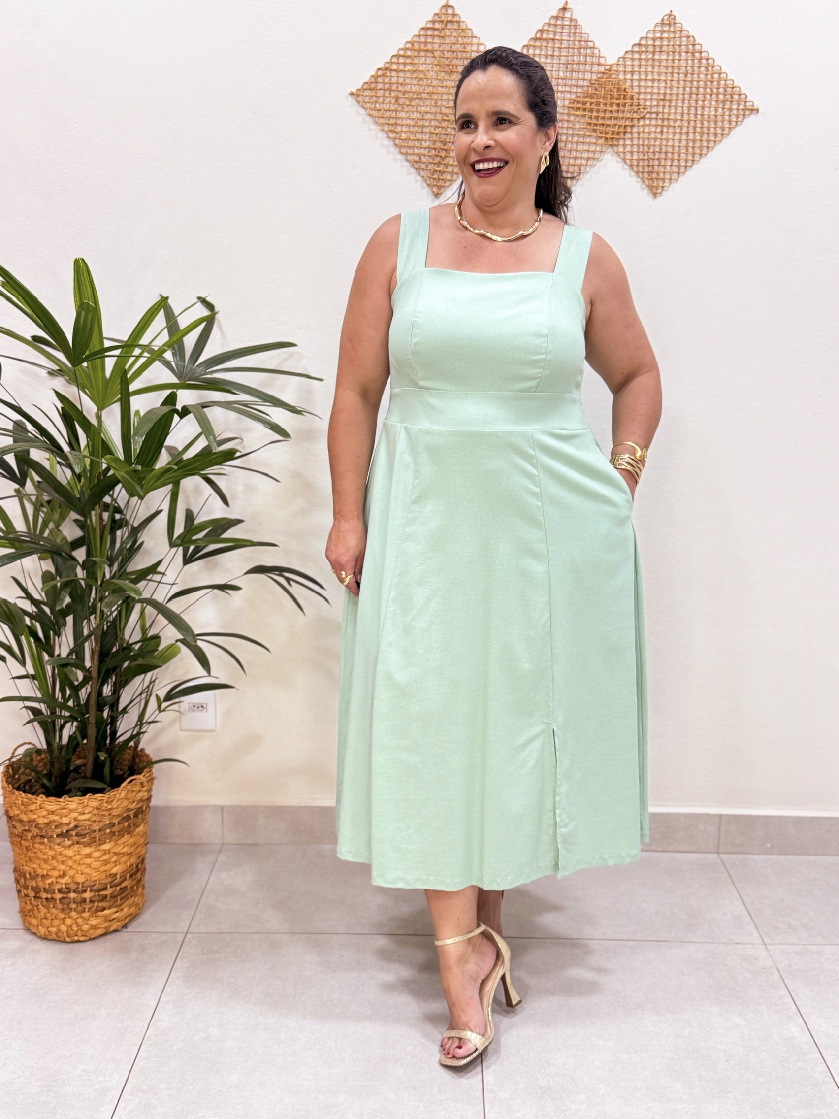 O Vestido Midi Brenda Plus Size, é confeccionado em linho, um tecido sem elastano, elegante, macio e muito confortável.