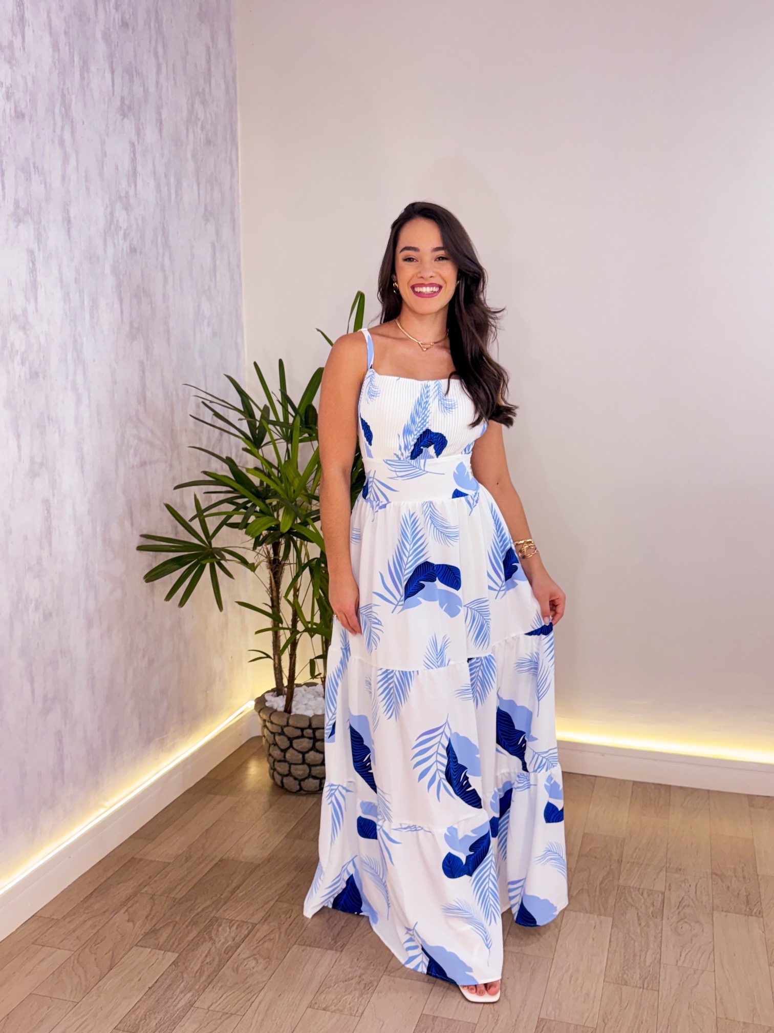 Vestido: Modelo de alças finas reguláveis, detalhe drapeado no busto, lastex nas costas, modelo de saia três marias.