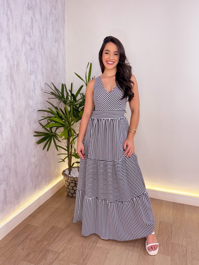 O Vestido Midi Marina Listrado Slim, é confeccionado em tecido crepinho, um tecido leve, macio e muito confortável.