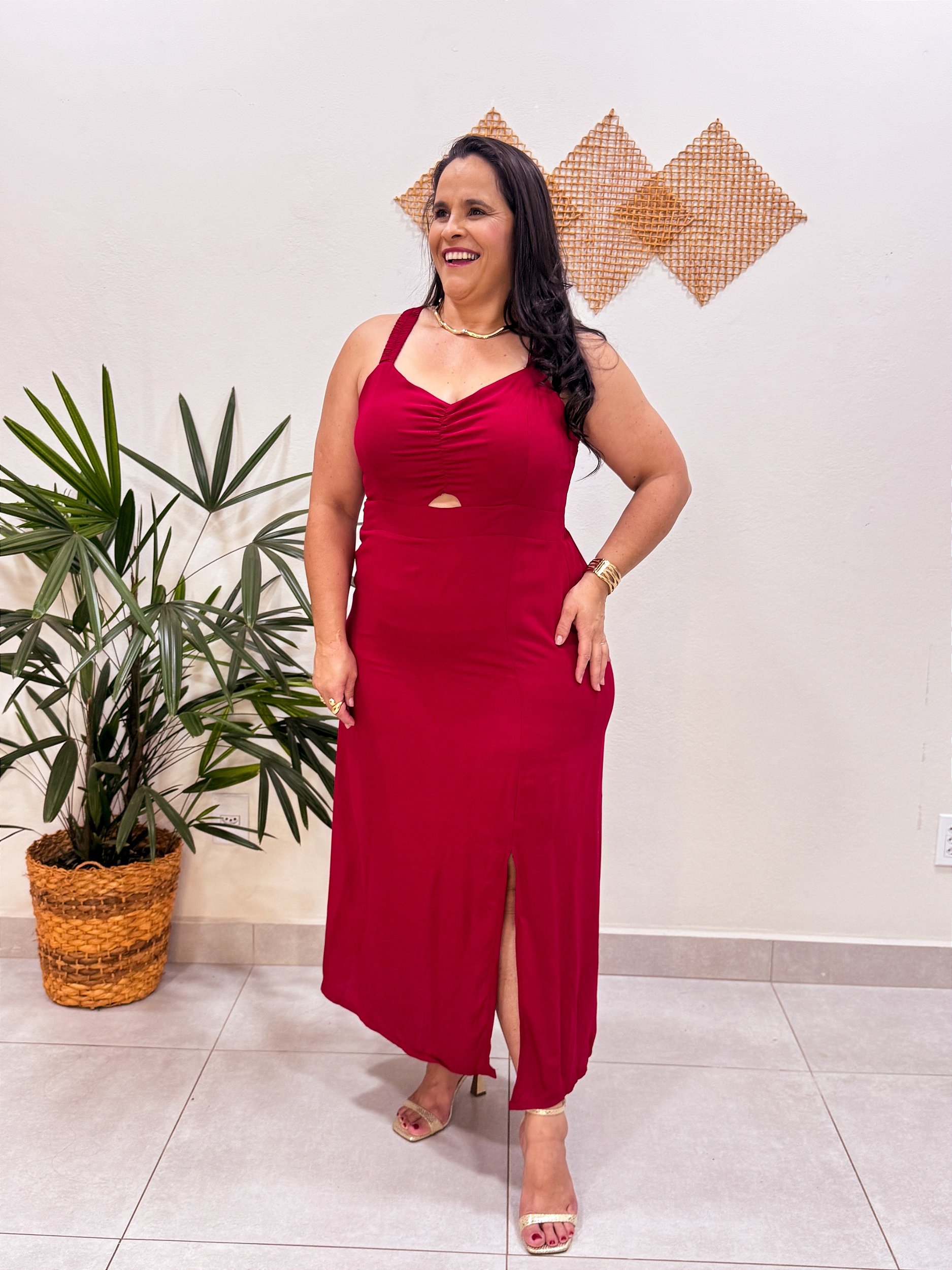 Vestido: Modelo com alças largas de elástico, decote em V com mine recorte vazado abaixo do busto. Ele possui lastex nas costas para se ajustar perfeitamente e modelagem de saia reta no comprimento midi.